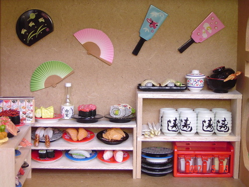 牆壁上的扇子裝飾很特別呢^O^ 壽司和森林家族的動物們還挺搭的~可愛呢!!
